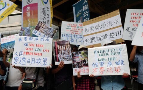 Người Việt tại Đài Loan cầm biểu ngữ có hình cá chết đòi chính phủ điều tra công ty Formosa ở Hà Tĩnh gây ô nhiễm biển miền Trung Việt Nam hồi năm 2016. Hình chụp hôm 18/6/2017 - AFP