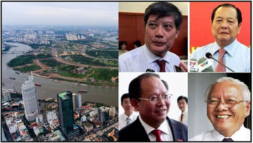 Lê Thanh Hải, Lê Hoàng Quân, Nguyễn Văn Đua, Tất Thành Cang và hỉnh ảnh Thủ Thiêm nhìn từ trên cao. RFA Edited.