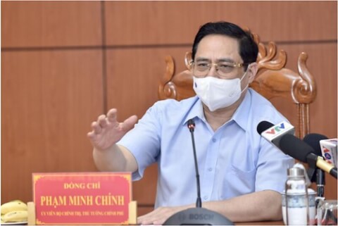 Thủ tướng Phạm Minh Chính phát biểu tại cuộc họp khẩn về phòng chống dịch Covid-19 tại đầu cầu trụ sở UBND tỉnh An Giang.