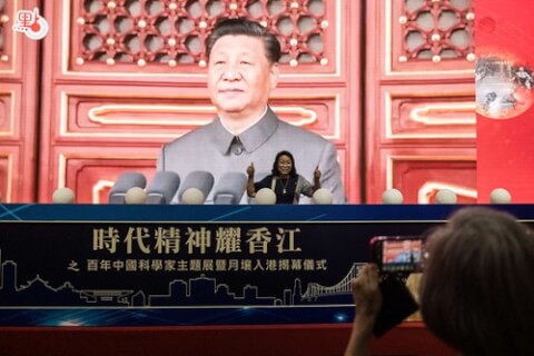 Chủ tịch Trung Quốc Tập Cận Bình phát biểu trên một màn hình lớn nhân kỷ niệm 100 năm thành lập Đảng Cộng sản Trung Quốc, màn hình ở Trung tâm Triển lãm và Hội nghị Hong Kong hôm 8/7/2021 - AFP