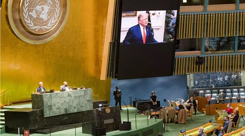Tổng thống Mỹ Donald Trump phát biểu, qua cầu truyền hình, tại khóa họp thứ 75 Đại hội đồng Liên Hiệp Quốc, New York, ngày 22/09/2020 via Reuters – United Nations