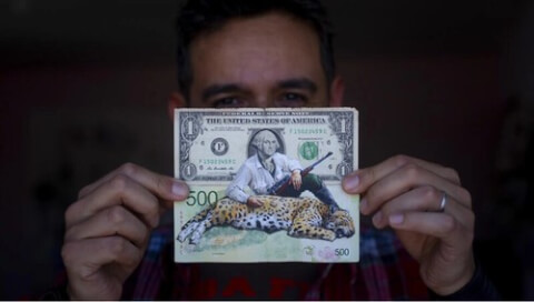 Nghệ sĩ Argentina Sergio Díaz và một tác phẩm nghệ thuật thể hiện cuộc khủng hoảng kinh tế của nước này : tờ đô la Mỹ và tờ 500 peso của Argentina, có hình George Washington cầm súng trường bên cạnh một con báo đốm đã chết. Ảnh chụp tại studio của ông ở Salta, Argentina, ngày 09/03/2023. AP - Javier Corbalan
