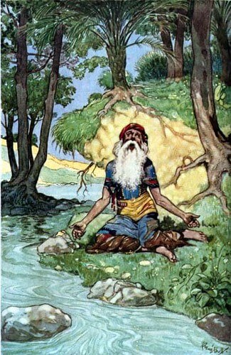 Một ông già đang ngồi bên bờ suối. Ông là người đẹp lão, có mái tóc bạc rủ xuống và chòm râu bạc.