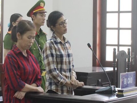 Bà Nguyễn Thị Ngọc Sương (trái) và Vũ Thị Dung ra tòa hôm 10 Tháng Năm, 2019, vì cáo buộc "rải truyền đơn chống phá nhà nước" với án tù 5 và 6 năm tù. (Hình : Báo Thanh Niên)
