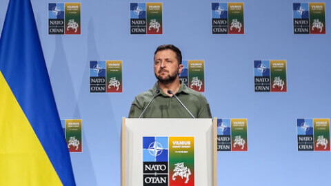 Tổng thống Ukraine Volodymyr Zelensky phát biểu trước hội nghị thượng đỉnh NATO vào ngày 12/07/2023 tại Vilnius - Dominika Zarzycka / NurPhoto / AFP