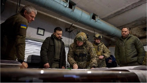 Tổng thống Ukraine Volodymyr Zelensky nghe tường trình của tư lệnh Lực lượng trên bộ Oleksandr Syrskyi khi đến thăm một vị trí của quân Ukraine tại Kupiansk, vùng Kharkiv, Ukraine, ngày 30/11/2023. via Reuters - Ukrainian Presidential Press Service