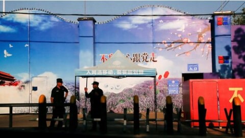An ninh Trung Quốc đứng gác trước cổng một " trung tâm dạy nghề", trên thực tế là trại tập trung người Duy Ngô Nhĩ ở vùng tân Cương. Ảnh chụp ngày 03/09/2018. Reuters - Thomas Peter
