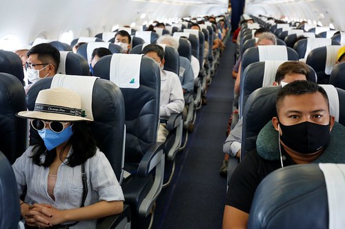 Hành khách đeo khẩu trang trên một chuyến bay của Bamboo Airways từ Đà Nẵng đi Hà Nội hôm 7/3/2020. Reuters