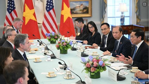 Bộ trưởng Ngoại giao Việt Nam Bùi Thanh Sơn (thứ nhất từ phải) và Đại sứ Việt Nam tại Mỹ Nguyễn Quốc Dũng (thứ hai từ phải) thảo luận với Ngoại trưởng Mỹ Antony Blinken (thử 3 từ trái) và các quan chức chính Hoa Kỳ tại Washington DC hôm 25/3.