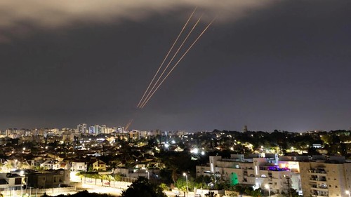 Các tên lửa hệ thống phòng không "Vòm sắt" của Israel bắn chặn cuộc tấn công tên lửa và drone của Iran vào miền trung Israel, rạng sáng ngày 14/04/2024. AP - Tomer Neuberg
