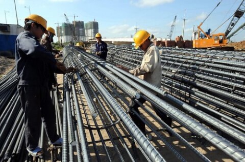 Công nhân đang cuộn những thanh thép cho một công trình xây dựng ở Hà Nội. AFP