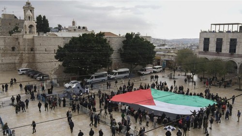 Người dân giương lá cờ Palestine khổ lớn trên quảng trường Nhà thờ Giáng Sinh tại Bethlehem, ngày 24/12/2023. AP - Mahmoud Illean