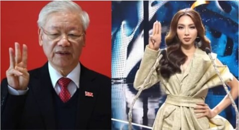 Hình ảnh Thùy Tiên đưa 3 ngón tay lên cao, đồng thời cắt bỏ đoạn cuối của video hùng biện với câu nói bằng tiếng Thái với cử chỉ được cho là nhạy cảm chính trị theo quan điểm của một bộ phận người "lo xa" ở Việt Nam.