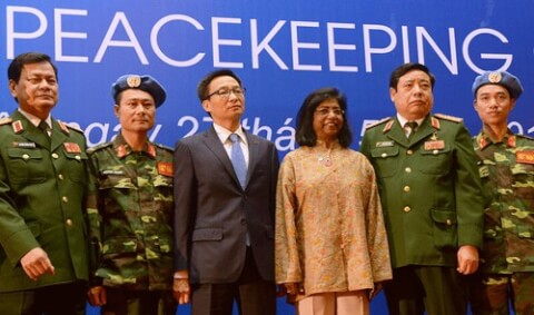 Hình minh họa. Hình chụp hôm 27/5/2014 ở Hà Nội : Phó tổng thư ký UN Ameerah Haq (thứ ba từ phải sang), Bộ trưởng Quốc phòng Phùng Quang Thanh (thứ 2 từ phải sang), Phó thủ tướng Vũ Đức Đam (thứ 3 từ trái sang) chụp cùng Mạc Đức Trọng và Trần Nam Ngạn, hai sĩ quan Việt Nam tham gia lực lượng gìn giữ hòa bình của UN ở Nam Sudan. AFP