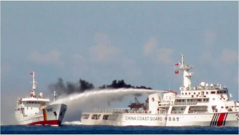 Một tầu hải cảnh Trung Quốc bắn vòi rồng vào tầu tuần tra Việt Nam ở Biển Đông, ngày 02/05/2019 Reuters/Vietnam Marine Guard/Handout via Reuters