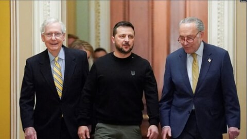 Lãnh đạo Khối Đa số Thượng viện Mỹ Chuck Schumer (phải) và lãnh đạo khối Thiểu số Mitch McConnell (trái) đi cùng Tổng thống Ukraine Volodymyr Zelenskiy khi ông đến thăm Washington, ngày 12/12/2023, để vận động thêm viện trợ.