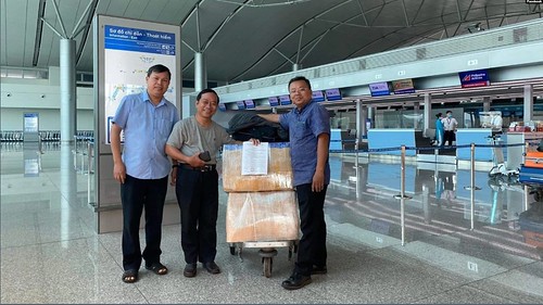 Linh mục Trương Hoàng Vũ (phải) và hai linh mục khác tại phi trường Tân Sơn Nhất vào ngày 24/10/2022.