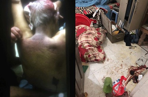 Trong video và những hình ảnh mới, người ta thấy lưng cụ Kình có nhiều vết bầm tím giống như bị đánh, chân trái bị đứt lìa từ phần đầu gối và đầu có vết máu.