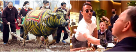 Ở đây, sự thách thức là những hành động cụ thể, những hành động không giống ai, ngáo, nhưng nó muốn khẳng định rằng bất kì sự ngáo oạp nào khi vào tay nhà lãnh đạo, vào tay ông trùm cũng sẽ thành điển cố, điển tích và đương nhiên đến một lúc nào đó, nó sẽ thành chuẩn mực, mẫu mực và khuôn thước… Đó là điều tất yếu, là những cú nhảy, là cuộc chơi li kì của nhà kĩ trị, nhà độc tài, của các ông trùm quyền lực. Chính vì vậy mà không phải ngẫu nhiên, Putin cố gắng ve vãn vợ của Tập Cận Bình ngay trước mặt Bình, rồi Tô Lâm đi ăn bò dát vàng để người ta quay video bỏ lên tik-tok hoặc gần đây nhất là Nguyễn Xuân Phúc đi dự lễ tịch điền, sau đó xuống ruộng cày với một con trâu vẽ vằn vện vàng như cọp mà trâu chẳng ra trâu, cọp chẳng ra cọp… khiến dư luận xôn xao mấy ngày nay. Và cả hai lượt xôn xao, từ vụ Tô Lâm ăn bò dát vàng cho đến Nguyễn Xuân Phúc cày trâu vẽ cọp đều tạo ra những cơn chấn động dư luận mà hầu hết đều chê.
