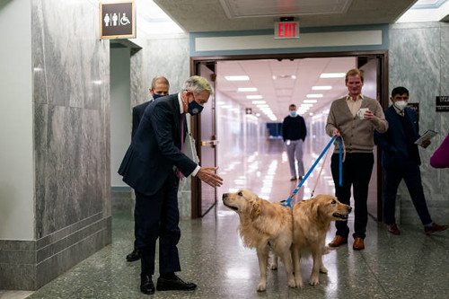 Ông Jerome Powell (trái), Chủ tịch Ngân hàng Dự trữ Liên bang, đang dừng chân để chơi với hai con chó trong hành lang Quốc hội ngày 11 tháng 1, 2022. (Kent Nishimura/ LA Times via Getty Images)
