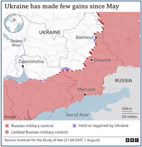 Trong hai tháng, quân đội Ukraine đã tiến được nhiều nhất là khoảng 16 km ở hai khu vực dọc theo chiến tuyến dài 160 km, theo các phân tích độc lập.