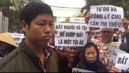 Trịnh Bá Phương (trái) trong một cuộc biểu tình về đất đai và đòi công lý cho mẹ là bà Cấn Thị Thêu - Hội Anh em Dân chủ