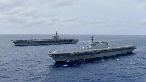 Tầu sân bay USS Ronald Reagan của Hải Quân Mỹ phối hợp diễn tập với tầu chở trực thăng JS Izumo của Lực lượng Phòng vệ Nhật Bản tại Biển Đông, ngày 11/06/2019.Courtesy JMSDF/U.S. Navy/Handout via REUTERS