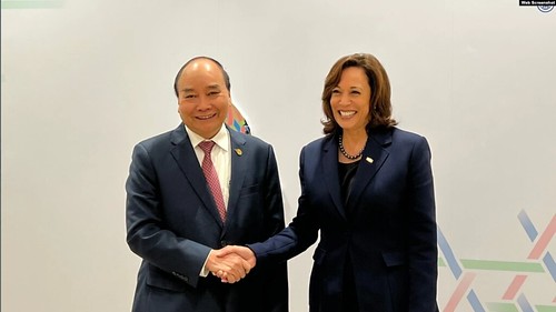 Phó Tổng thống Hoa Kỳ Kamala Harris có cuộc gặp với Chủ tịch nước Việt Nam Nguyễn Xuân Phúc bên lề Hội nghị các nhà Lãnh đạo Diễn đàn Hợp tác Kinh tế Châu Á-Thái Bình Dương (APEC) tại Bangkok, Thái Lan, ngày 18/11/2022. Photo VOV.vn