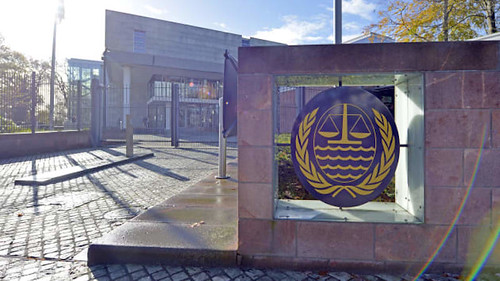 Biểu tượng của Tòa án Quốc tế về Luật Biển (ITLOS) tại lối vào của tòa án ở Hamburg, Đức.