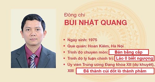 Phó Giáo sư – Tiến sĩ - Ủy viên Ban chấp hành trung ương Đảng cộng sản Việt Nam - Chủ tịch Viện Hàn lâm Khoa học xã hội Việt Nam - Phó Chủ tịch Hội đồng Lý luận của Ban chấp hành trung ương Đảng cộng sản Việt Nam Bùi Nhật Quang, một ngôi sao vừa "tr ẻ", vừa "đ ỏ" đã thôi chiếu sáng !
