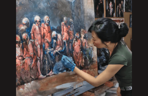 Họa sĩ Kim Chi trong xưởng vẽ của cô ở Normandie, Pháp. © Kim Chi