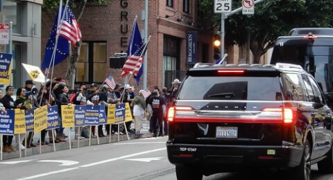 Xa xa thấy cờ vàng ba sọc đỏ, tôi biết là nơi biểu tình của người Việt. Ông Jimmy Phan điều phối, có mặt bác sĩ Phạm Đức Vượng, ông Thiện Ý, bà Cao Thị Tình, ông Viêm Mai là những nhân vật cộng đồng quen thuộc của vùng Vịnh cùng vài chục người Việt trải dài theo lề đường phất cờ, hô khẩu hiệu sau hàng rào an ninh cao hơn đầu người. Mấy bạn trẻ với loa tay vang vang cất tiếng cho mọi người hô theo : "Down with Vietnamese communist", "Communist go home", "Down with Vo Van Thuong", "Down with Xi Jinping", "No Tiktok", "No Fentanyl", "Human Rights for Vietnam".