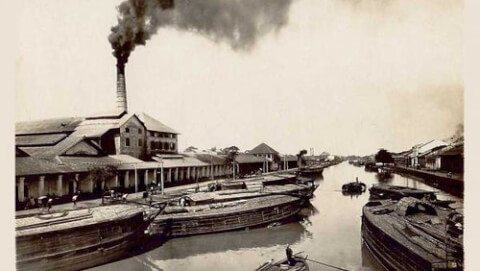 Ông khói của một xưởng xay xát gạo được xây bên bờ rạch Chợ Lớn trong những năm 1910. Ảnh trích space in asia
