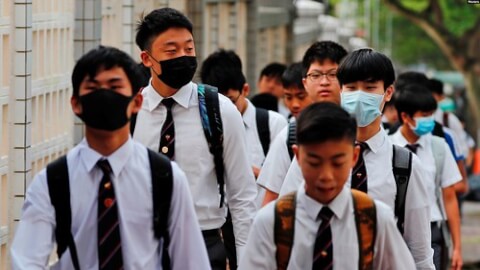 Học sinh La Salle College đeo khẩu trang bất chấp lệnh cấm của chính quyền.