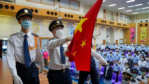 Nghi thức chào cờ Trung Quốc trong buổi lễ khai giải tại một trường trung học ở Hồng Kông, ngày 01/09/2021. AP - Kin Cheung