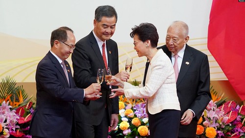 Trưởng đặc khu hành chính Hong Kong, bà Carrie Lam nâng ly chào mừng ông Wang Zhimin, giám đốc văn phòng liên lạc Trung Quốc tại Hong Kong, ngày 1/7/2019.