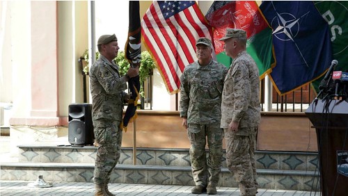 Tướng Scott Miller (trái), chỉ huy trưởng lực lượng Mỹ ở Afghanistan trao quyền lại cho tướng thủy quân lục chiến Frank McKenzie (phải) tại bộ chỉ huy ở Kabul ngày 12/07/2021. AP - Ahmad Seir