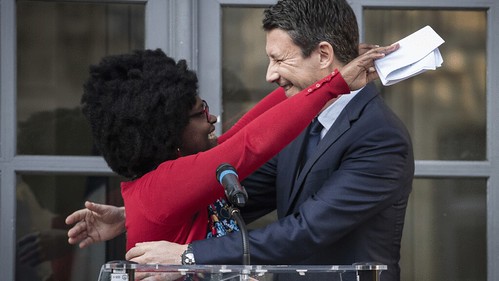 Ông Benjamin Griveaux trong buổi lễ bàn giao nhiệm vụ phát ngôn viên chính phủ cho người kế nhiệm, bà Sibeth Ndiaye (trái), Paris, 01/04/2019. Thomas SAMSON / AFP
