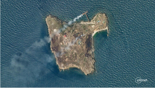 Ảnh vệ tinh cho thấy khói bay lên từ đảo Rắn của Ukraine, ngày 29/06/2022. via Reuters - PLANET LABS PBC