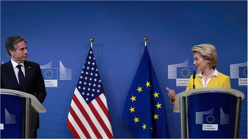 Ngoại trưởng Mỹ Antony Blinken và chủ tịch Ủy Ban Châu Âu Ursula von der Leyen trong cuộc họp báo chung tại trụ sở Liên Hiệp Châu Âu, Bruxelles, Bỉ, ngày 24/03/2021. AP - Virginia Mayo