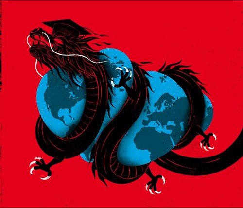 Libération trên nền mầu đỏ rực, đăng ảnh một con rồng đen quấn chặt lấy quả địa cầu méo mó, chạy hàng tít lớn : "Tư tưởng Trung Quốc xâm nhập vào các trường đại học Pháp, báo động đỏ trên nền bảng đen".