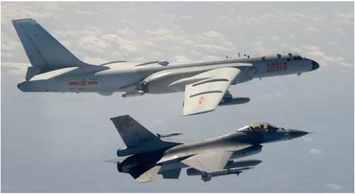 Ảnh tư liệu chụp ngày 10/02/2020 do Bộ Quốc phòng Đài Loan công bố : Một chiếc F-16 của Không quân Đài Loan (phía dưới) áp sát một oanh tạc cơ H-6 của Không Quân Trung Quốc khi chiếc máy bay này đến gần Đài Loan. AP