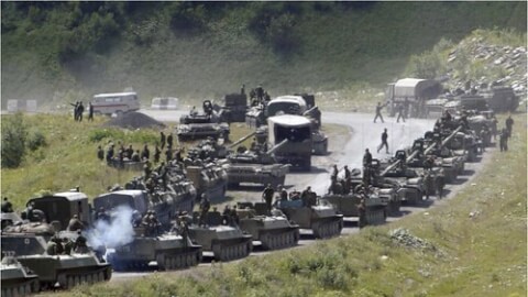 Đoàn xe tăng Nga tiến về Nam Ossetia của Georgia ngày 09/08/2008, chỉ bốn tháng sau khi hội nghị thượng đỉnh NATO ở Bucharest quyết định chưa kết nạp hai nước Ukraine và Georgia. AP - Musa Sadulayev