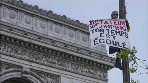 Một nhà đấu tranh vì Tây Tạng tự do mang biểu ngữ trước Khải Hoàn Môn Paris với dòng chữ "Nhà độc tài Tập Cận Bình, thời của ngươi đã hết". Ảnh chụp ngày 04/05/2024 AP - Michel Euler
