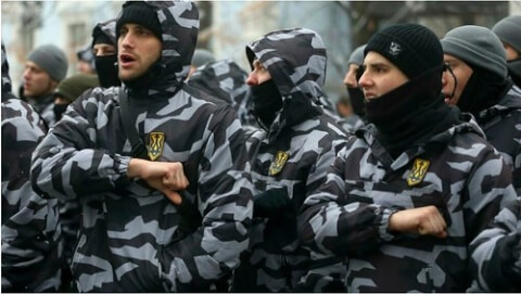 Các tình nguyện viên thuộc lực lượng dân quân cánh hữu Azov tập hợp trước Quốc Hội Ukraine ở Kiev ngày 26/11/2018, đòi hỏi không lùi bước trước Nga. AP - Efrem Lukatsky