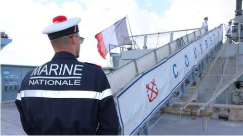 Một người lính Hải quân Pháp bên cạnh chiến hạm Courbet neo đậu ở căn cứ Guam, nhân cuộc tập trận chung Mỹ, Nhật, Pháp, Anh tại Thái Bình Dương. Ảnh tư liệu chụp ngày 11/05/2017. AP - Haven Daley