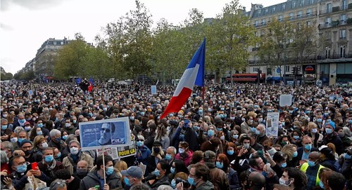 Đông đảo người Pháp tập trung tại quảng trường Cộng hòa - République, Paris ngày 18/10/2020 để tưởng nhớ thầy giáo Samuel Paty, người bị khủng bố Hồi giáo sát hại dã man. Reuters – Charles Platiau