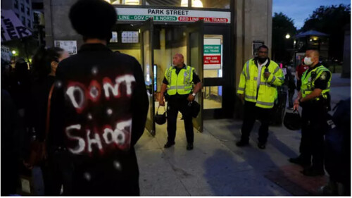 Một người biểu tình mặc áo lưng có hàng chư "Đừng bắn" đứng bên cạnh lực lượng cảnh sát, tại Boston, Massachusetts, Mỹ, ngày 07/06/2020 Reuters - Brian Snyder
