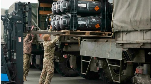 Một binh sĩ Ukraine chất tên lửa chống tăng Javelin do Mỹ cung cấp. Ảnh chụp ngày 11/02/2022 tại phi trường Boryspil, gần Kiev. AP - Efrem Lukatsky