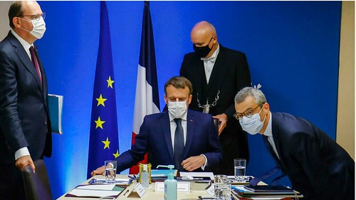 Tổng thống Pháp Emmanuel Macron (giữa), thủ tướng Jean Castex (trái) trong cuộc họp khẩn tại điện Elysée ngày 22/07/2021 sau tiết lộ về khả năng điện thoại ông Macron và nhiều chính khách Pháp bị phần mềm gián điệp Pegasus nhắm đến. AP - Ludovic Marin